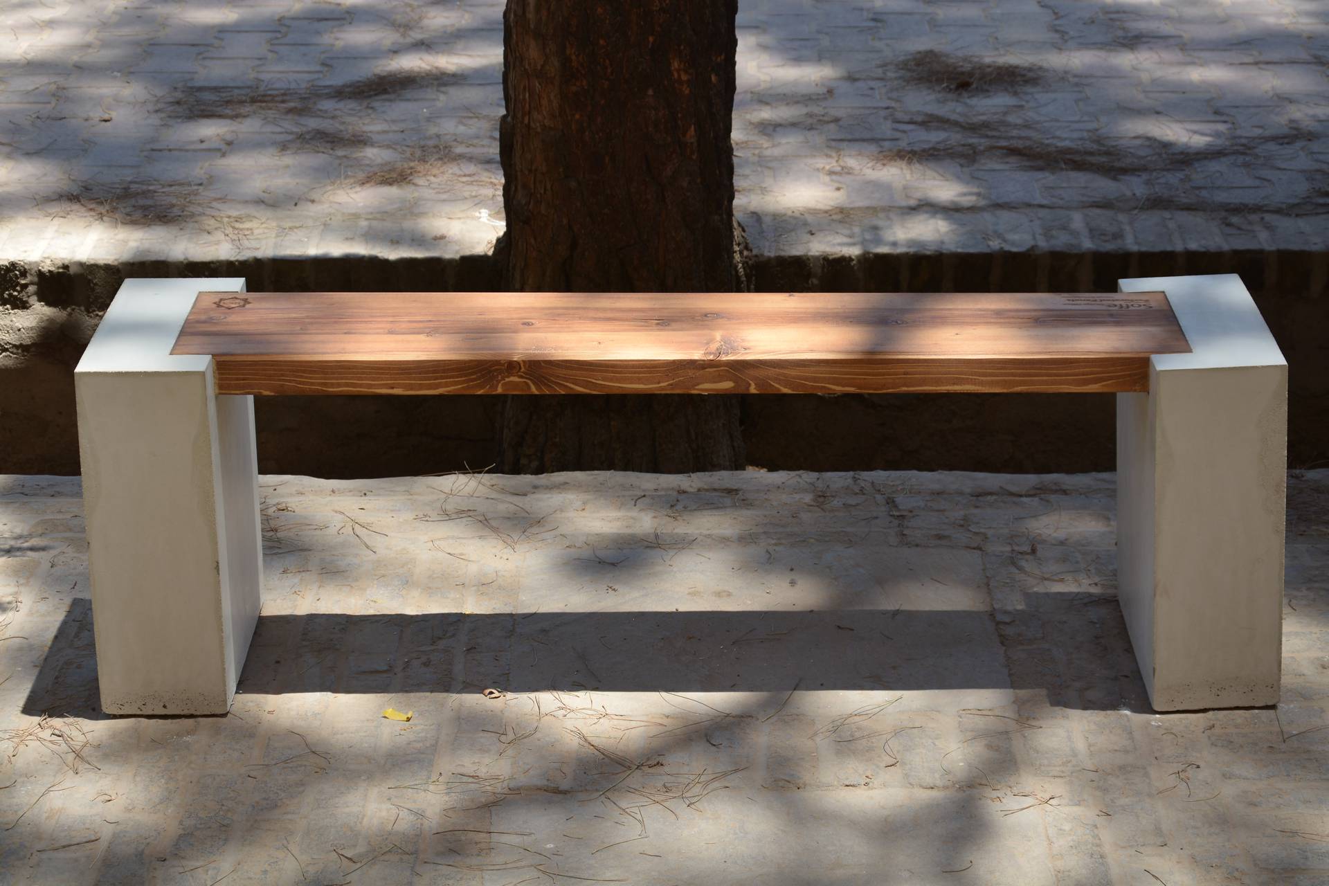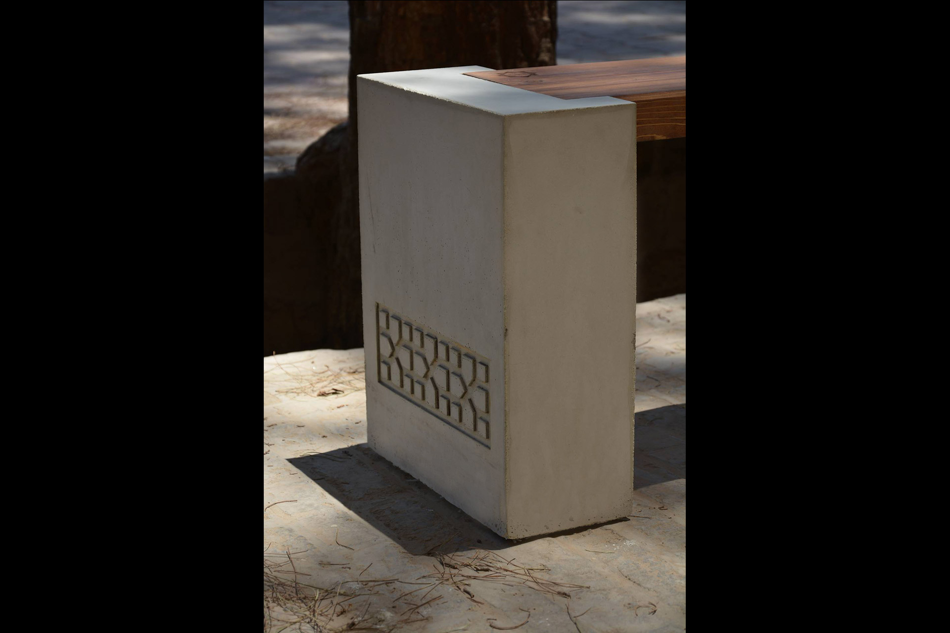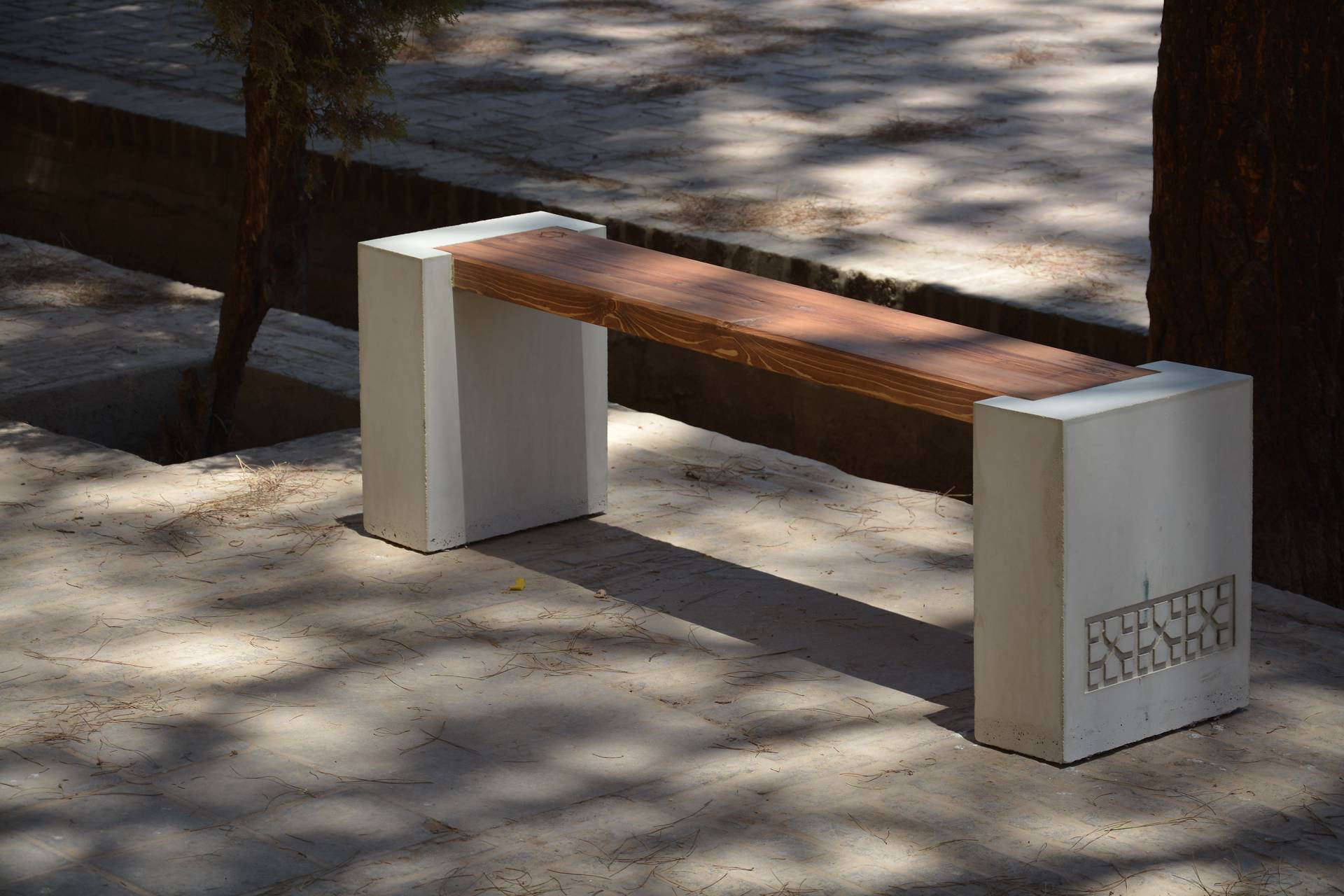 نیمکت نشیمن ترکیب زیبایی از بتن و چوب کاج روغن خورده می باشد. طراحی ساده این نیمکت باعث می شود برای استفاده در فضاهای مدرن مناسب باشد. در جداره پایه های بتنی از نقوش اصیل معماری ایرانی- اسلامی استفاده شده است. این پایه ها به سفارش شما می توانند ساده یا دارای طرح سفارشی باشند.